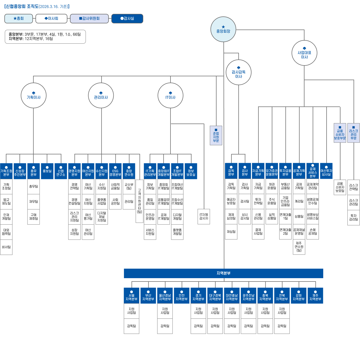 중앙회의 기관은 총회(대의원회), 이사회, 감사위원회가 있습니다. 중앙본부는 3부문, 17본부, 4실, 1원, 1소, 66팀 체제로 책임경영체제 확립을 위한 사업대표 이사제, 검사감독이사제 및 예금자보호기구 등이 설치되어 있습니다.