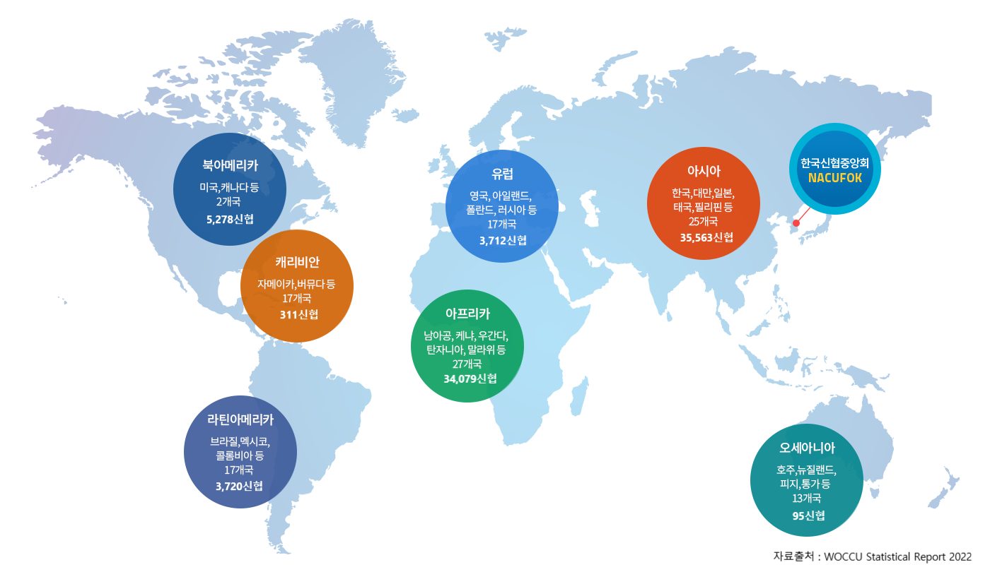 우리나라 신협은 아시아신협연합회(ACCU), 세계신협협의회(WOCCU), 국제협동조합연맹(ICA), 국제라이파이젠연맹(IRU) 등 국제적인 신협기관 및 국제협동기구와 유기적인 관계를 맺고 활발한 활동을 펼쳐 나가고 있습니다.